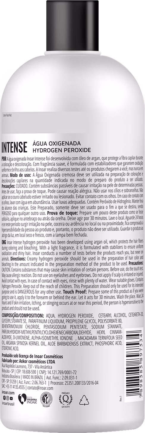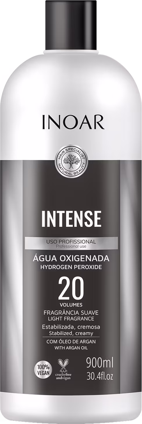 Água oxigenada de 20 volumes. Inoar Intense Água Oxigenada 20 volumes é formulada com estabilizadores que garantem resultado de cor uniforme e com brilho.
