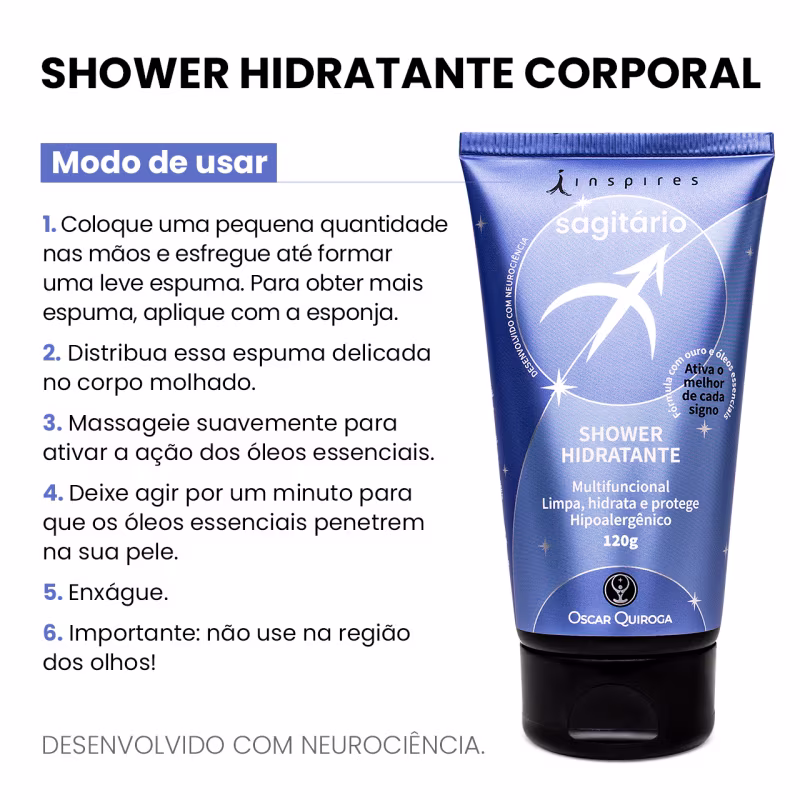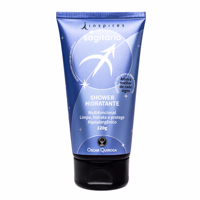 Shower hidratante corporal com essência do signo de Sagitário. Inspires Oscar Quiroga limpa, hidrata e proporciona a sensação de bem-estar.