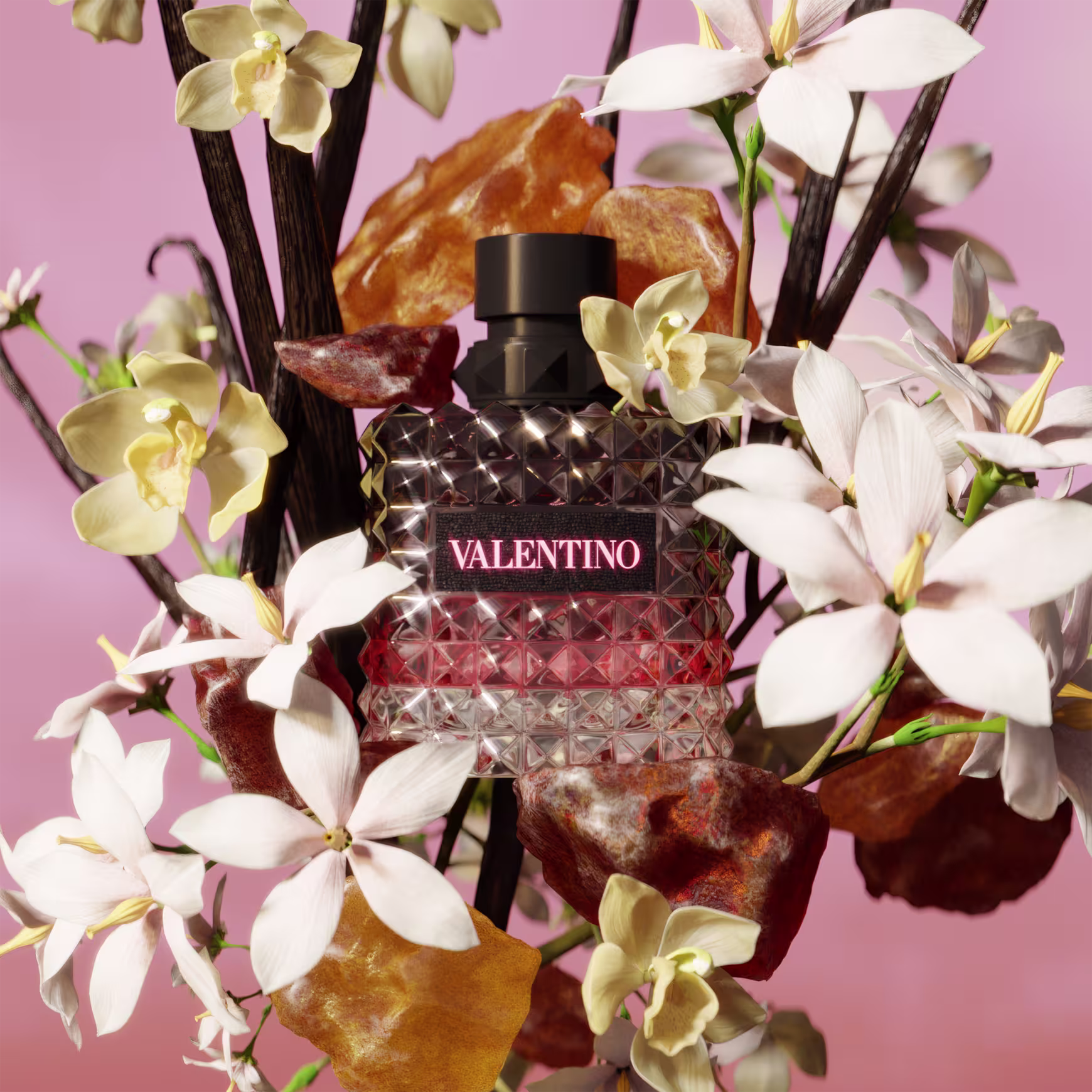 O aroma de Born In Roma Donna Intense Eau de Parfum é impulsionando por uma poderosa baunilha e um trio de jasmim luminoso. É perfeito para quando você precisar de uma dose de energia e autoestima. O frasco presta homenagem ao icônico Valentino Rockstud, as famosas e desejadas “tachinhas” de Valentino presentes nas bolsas e sapatos da marca. Esse design piramidal arrojado, inspirado na arquitetura romana, é uma assinatura da Maison Valentino.