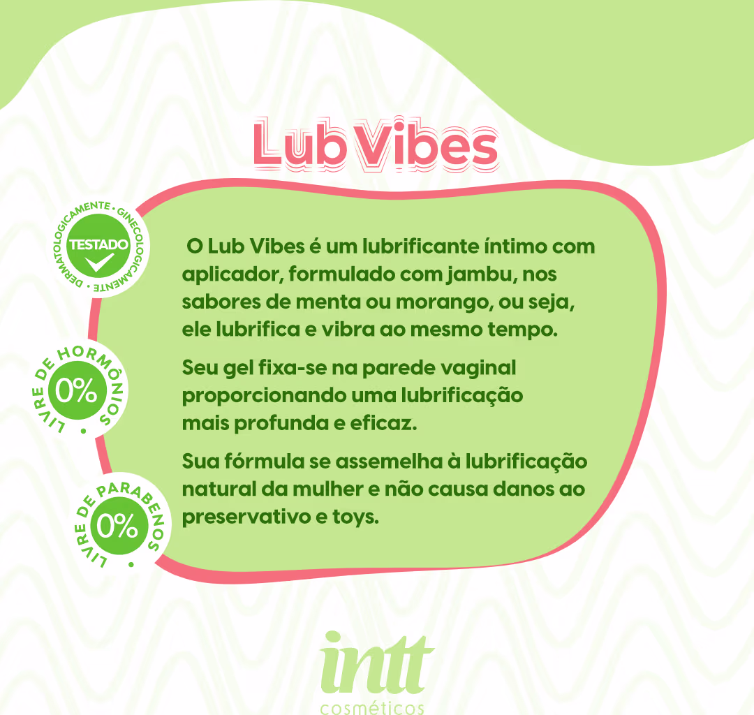 O Lubrificante Íntimo Intt Lub Viber vem com aplicador também vibra proporcionando muito mais prazer para seus momentos de intimidade. Sua fórmula se assemelha a lubrificação natural da mulher e não causa danos ao preservativo e sex toys.