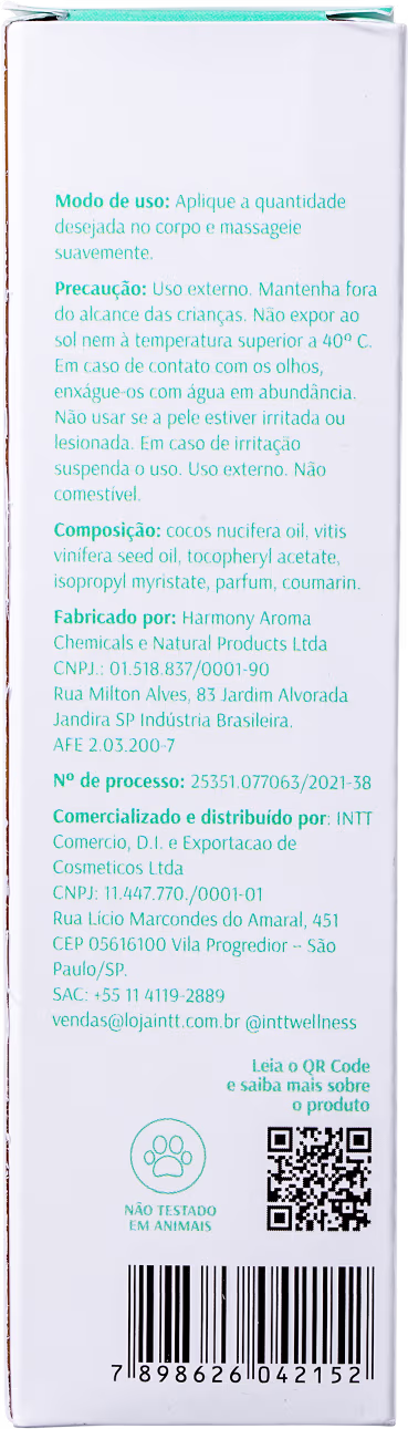 O Óleo Intt Wellness Velvet Skin possui componentes naturais que proporcionam suavidade, hidratação e luminosidade a pele. Seu aroma de coco desperta respostas fisiológicas com o intuito de melhorar a energia e o bem-estar físico e psicológico. Pode ser usado para hidratar, ressaltar o bronzeado, em massagens e momentos íntimos.