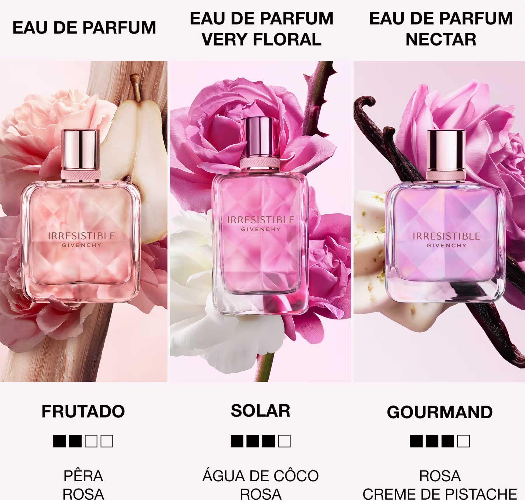 • ▸ Mantém o DNA floral da linha Irresistible, com Rosas marcantes que ganham uma textura mais refinada e envolvente;