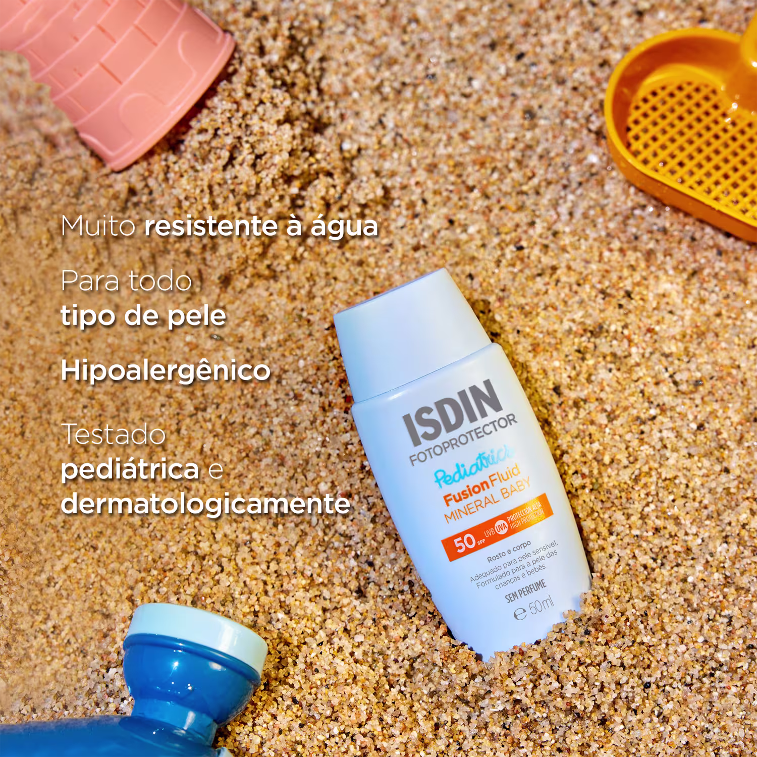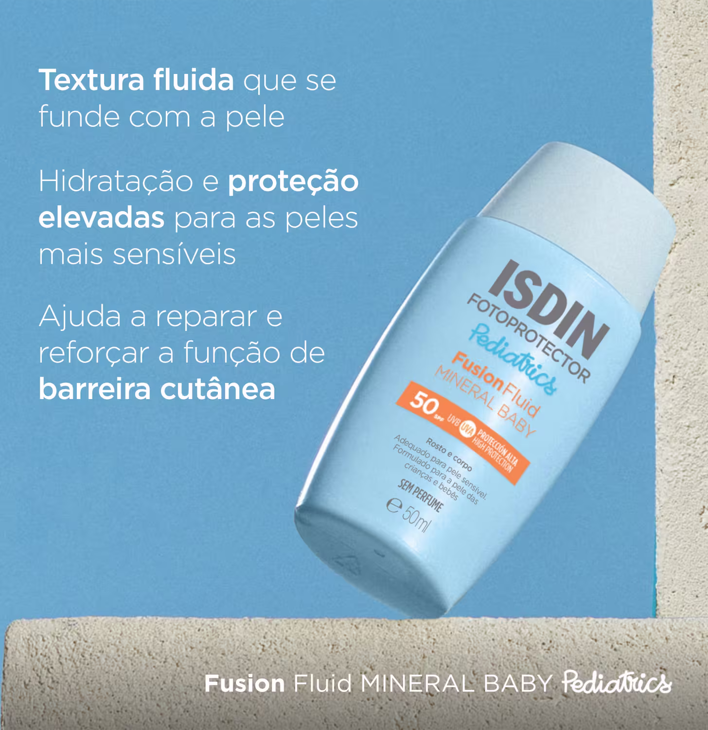 O Protetor Solar Infantil ISDIN Fusion Fluid Mineral Baby FPS 50 foi desenvolvido especialmente para bebês e crianças a partir de 6 meses, oferecendo alta proteção com filtros 100% minerais. Sua textura Fusion Fluid se adapta perfeitamente à pele sensível, garantindo defesa eficaz contra os raios UV com hidratação intensa e toque suave. Enriquecido com extrato de Sempre-Viva, Vitamina E e Pantenol, acalma, nutre e protege a pele delicada. Hipoalergênico, sem perfume e muito resistente à água, é ideal para os momentos de diversão ao ar livre, com a segurança aprovada por pediatras e dermatologistas.