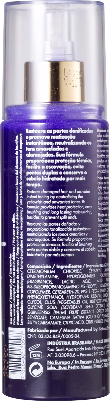Fluido para escova para cabelos loiros, platinados ou alaranjados. Itallian Hairtech Trivitt Matizante com ação térmica resgata o brilho do platinado e protege da oxidação.