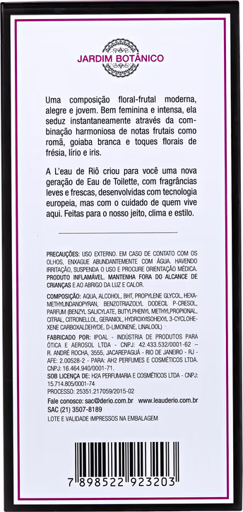 A fragrância é um floral frutal ideal para mulheres alegres, modernas e que amam a vida. L'Eau de Riô Jardim Botânico traz uma essência adocicada repleta de frescor, assim como a brasileira.