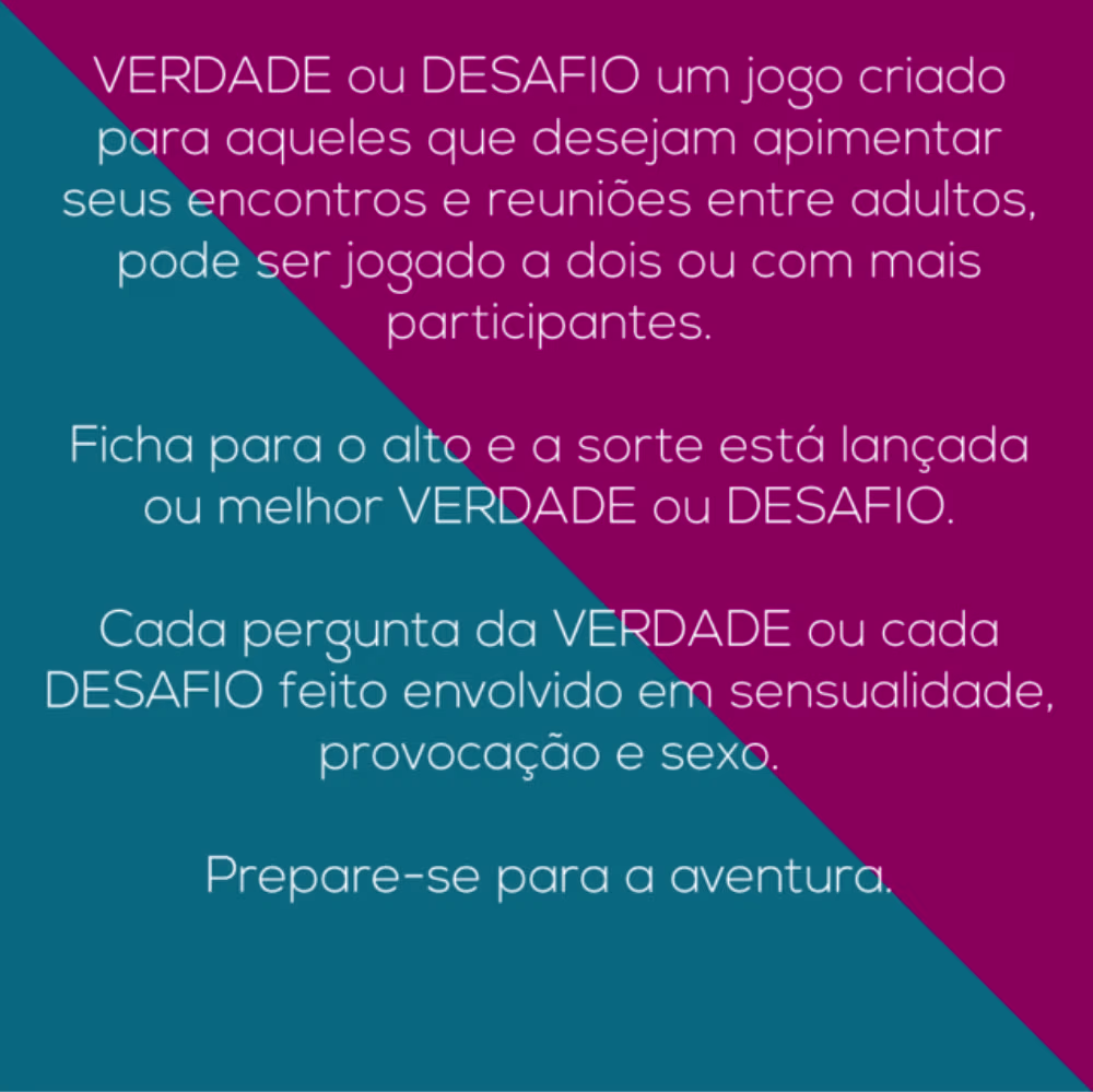 O Jogo de Cartas Erótico Jogos Secretos Verdade Ou Desafio pode ser jogado a dois ou com mais participantes. Ao jogar a ficha a sorte estará lançada: cada pergunta da verdade ou cada desafio foi elaborada para criar envolvimento, sensualidade, provocação e sexo.