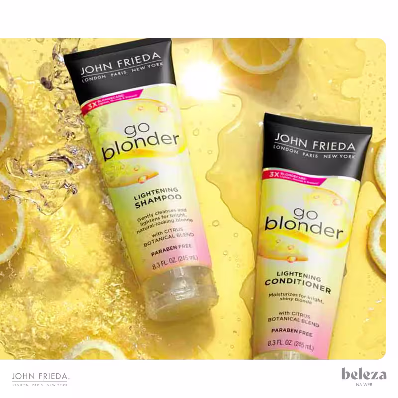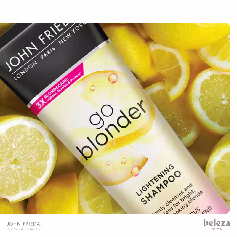 O Shampoo Sheer Blonde Go Blonder Lightening, de John Frieda, traz ativos que depositam os pigmentos de cor no cabelo suavemente para deixá-lo ainda mais loiro. Ainda possui fórmula altamente hidrante que devolve o brilho aos fios opacos. Por agir com leveza, pode ser usado diariamente.