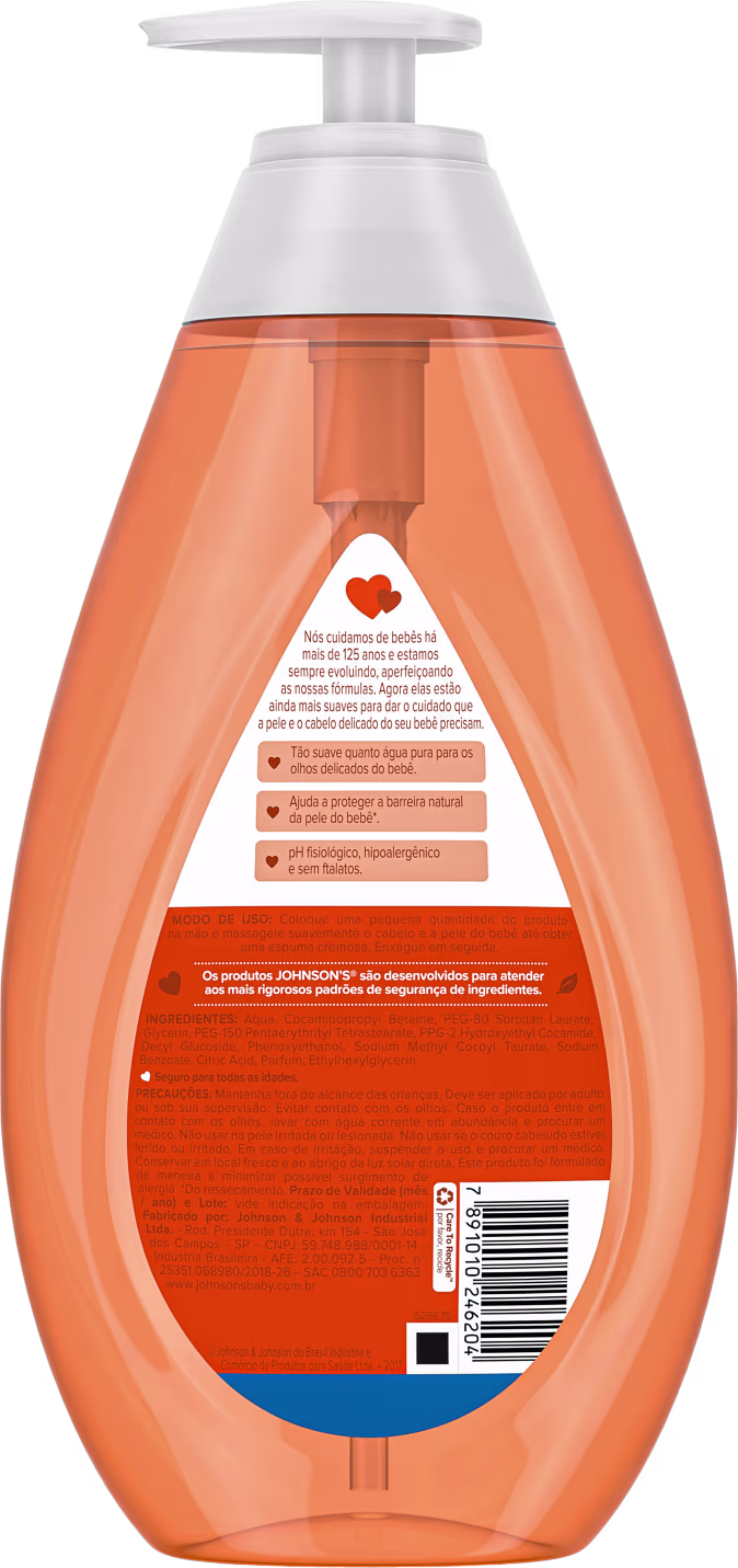 O Sabonete Líquido Johnson's Baby Da Cabeça Aos Pés é feito com glicerina vegetal, com o mesmo pH do corpo, para um banho suave e nada agressivo à pele. Possui uma fórmula Chega de Lágrimas é tão suave quanto a água pura, para tornar os cuidados com os olhos, a pele e o cabelo do bebê muito mais tranquila. Sua composição também é hipoalergênica, testada dermatologicamente e oftalmologicamente.