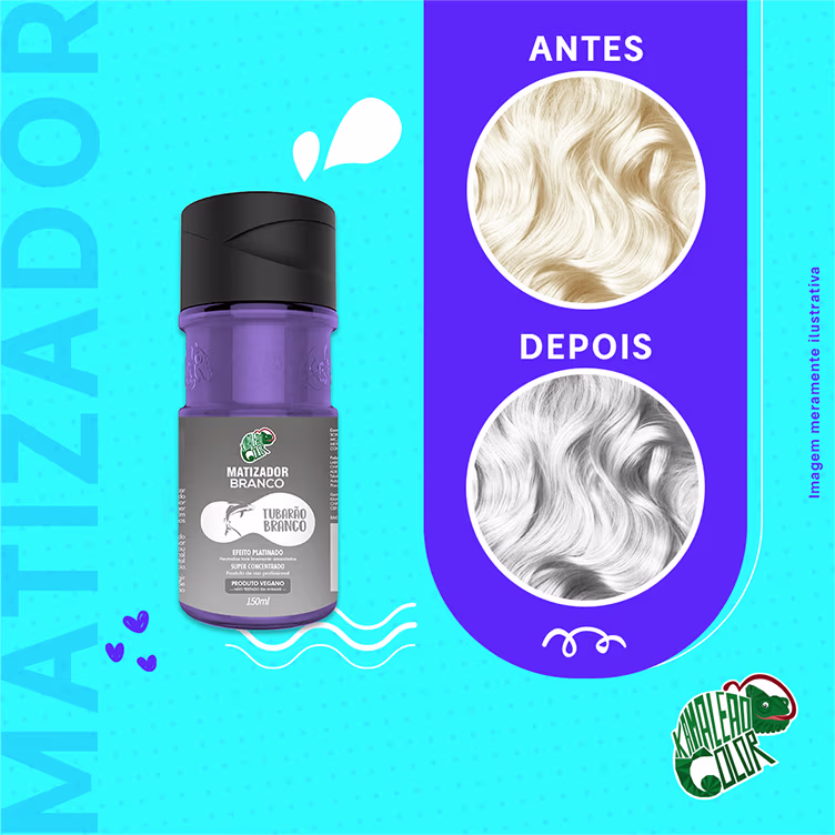 O Matizador Kamaleão Color Tubarão Branco apresenta fórmula vegana com alta concentração. Foi desenvolvido para ser usado com diluidor para atingir os resultados desejados e garantir o efeito platinado incrível e duradouro aos cabelos loiros e descoloridos. Sem parafina, óleo mineral, parabenos e derivados de animais.