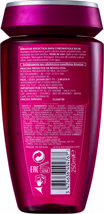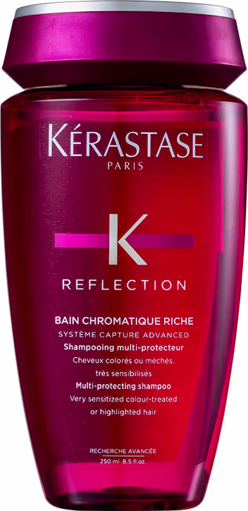 Kérastase Réflection Bain Chromatique Riche conta com uma tecnologia de multiproteção da cor que evita o desbotamento. Ela combate o depósito de pigmentos indesejados que mancham os fios e alteram o tom, além de neutralizar as partículas de água que desbotam o cabelo durante as lavagens. Seus fios ficam limpos, restaurados, com a cor protegida, linda e cheia de brilho.