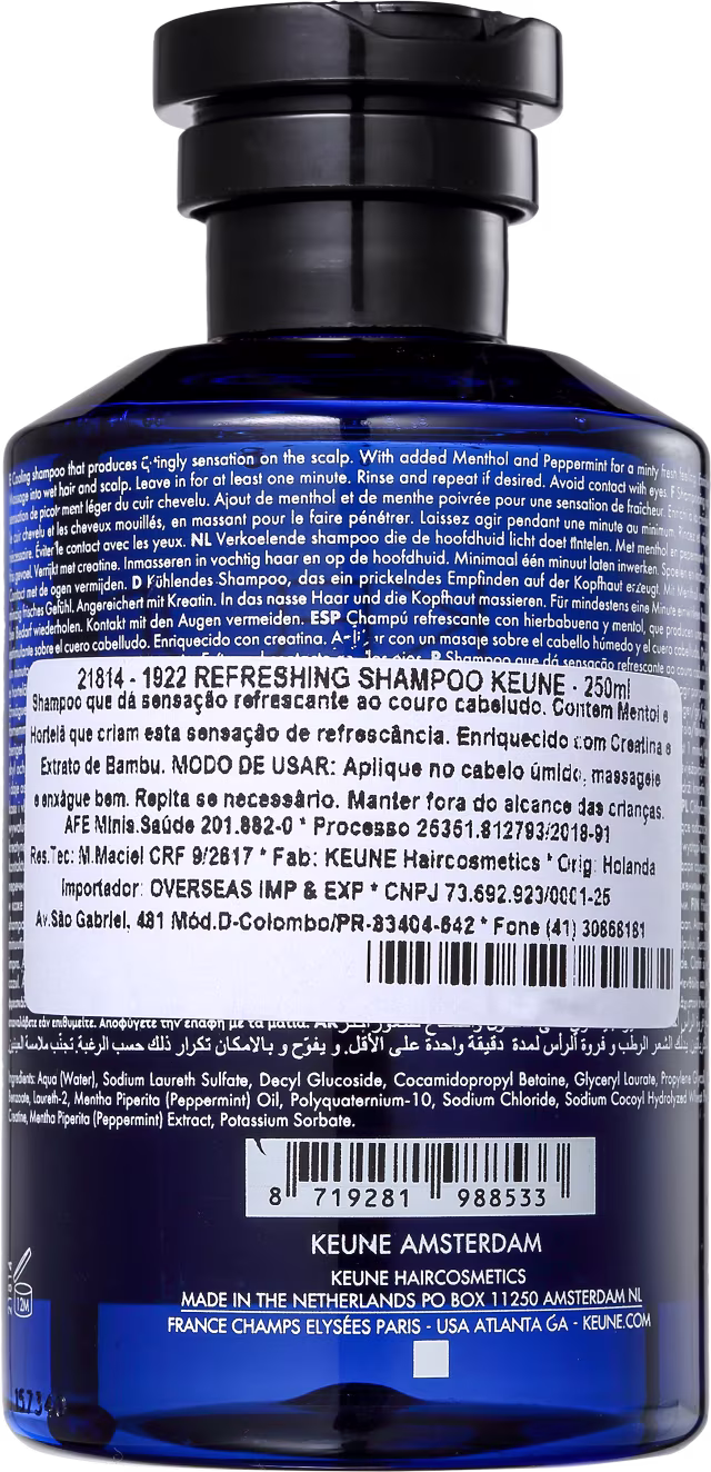 Shampoo Keune 1922 By J. M. Keune Refreshing proporciona limpeza e sensação de frescor. Além disso, possui propriedades adstringentes, anti-inflamatórias, antissépticas e antioxidantes. Para facilitar a rotina de beleza masculina, ele também pode ser usado na barba.