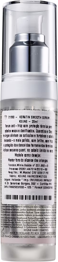 Keune Care Keratin Smooth Sérum repõe a queratina perdida por conta da química, reestruturando o fio e alinhando as cutículas, assim, reduz o frizz e a quebra. Ainda conta com protetor térmico, sendo um excelente finalizador.