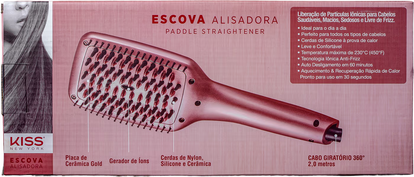 Escova Térmica Kiss New York Gold Edition traz praticidade ao dia a dia de quem deseja estar sempre com o cabelo arrumado, pois alisa enquanto penteia. Com boa aderência aos fios e fácil manuseio, ela proporciona conforto durante o uso.
