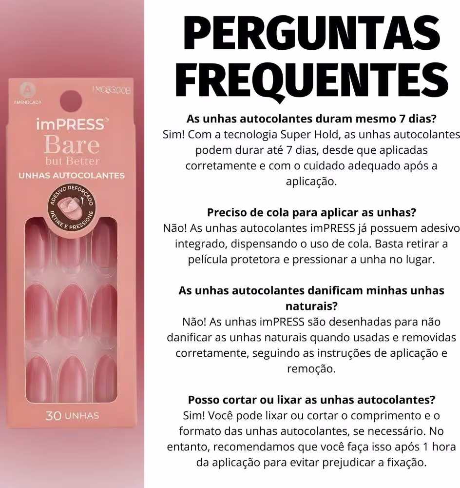 Unhas postiças autocolantes. Kiss New York imPress Bare But Better conta com tecnologia para melhor ajuste nas cutículas e adesivo reforçado.