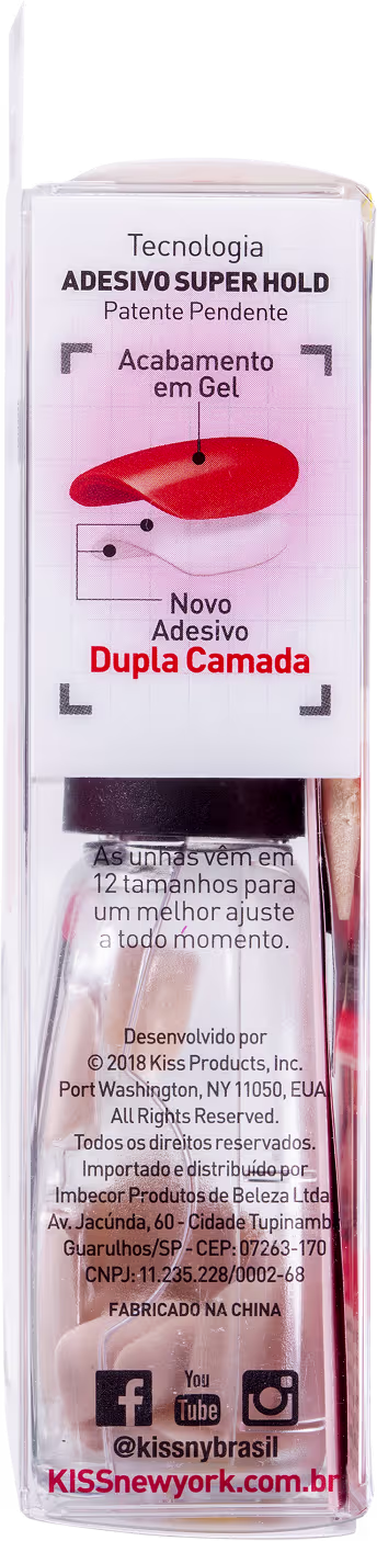 As Unhas Postiças Kiss New York Impress Curta são autocolantes e permitem uma transformação instantânea, sem precisar fazer sujeira com cola ou esmalte. Sua tecnologia Super Hold e camada dupla de adesivo garantem fixação prolongada e confortável, além de não danificar as unhas naturais. Não lascam e duram por até 7 dias. Efeito ultra gel brilho que garante cobertura brilhante superior ao esmalte comum.