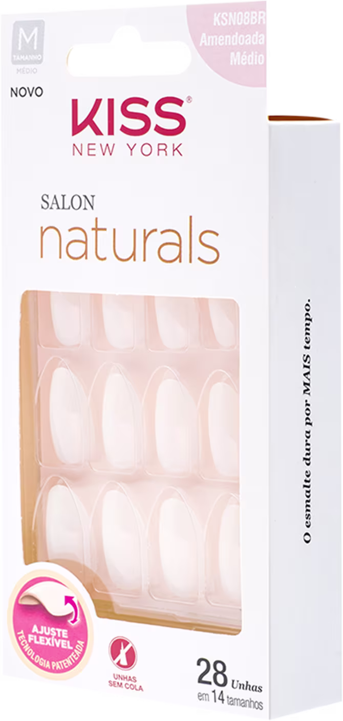 Unhas postiças com formato amendoado médio. Kiss New York Salon Naturals são moldáveis e flexíveis para um encaixe ideal nas mãos, para um resultado lindo e natural.