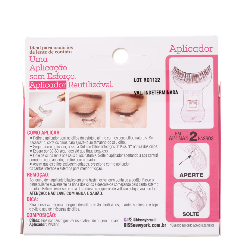 Cílios postiços. Fios alinhados e densos para dar bastante volume. Acompanham aplicador que facilita a aplicação e é reutilizável.