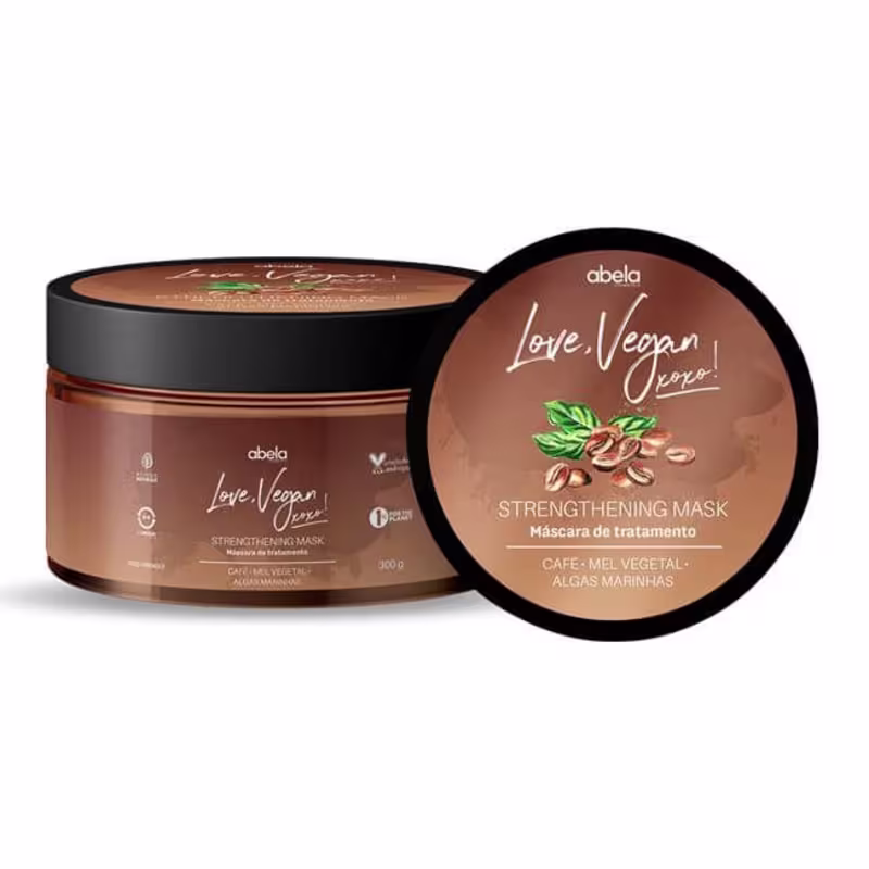 Abela Cosmetics Love, Vegan Café - Máscara Capilar 300g: possui em sua composição mel vegetal, algas marinhas, colágeno vegetal, café e vitaminas que ajudam a manter os fios saudáveis e livres do ressecamento. É uma máscara de tratamento profundo mas que pode ser usada sempre que você lavar os cabelos. Sua fórmula leve e eficaz promove brilho, maciez e evita pontas duplas.