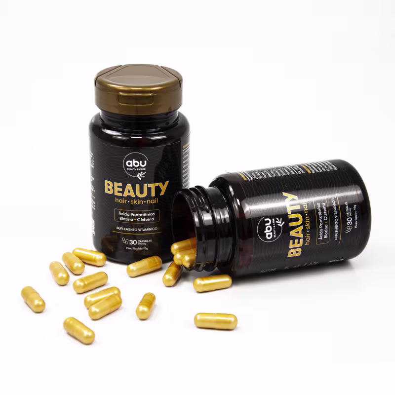 O Kit de Complexo Vitamínico em cápsulas Abu Cosméticos Beauty Cabelo Pele e Unha é composto por 3 principais ingredientes (Ácido Pantotênico, Biotina e Cisteína) que proporcionam ótimos benefícios para a saúde e também a melhora da auto estima com seus resultados de cabelos fortes e nutridos, pele saudável e unhas fortes! Sem Glúten, sem Lactose e sem Açúcar!