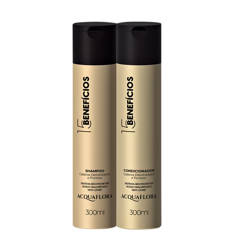 Kit com shampoo e condicionador para cabelos desidratados e porosos. Acquaflora 15 Benefícios Duo limpa os fios preenchendo a fibra capilar e garantindo proteção.
