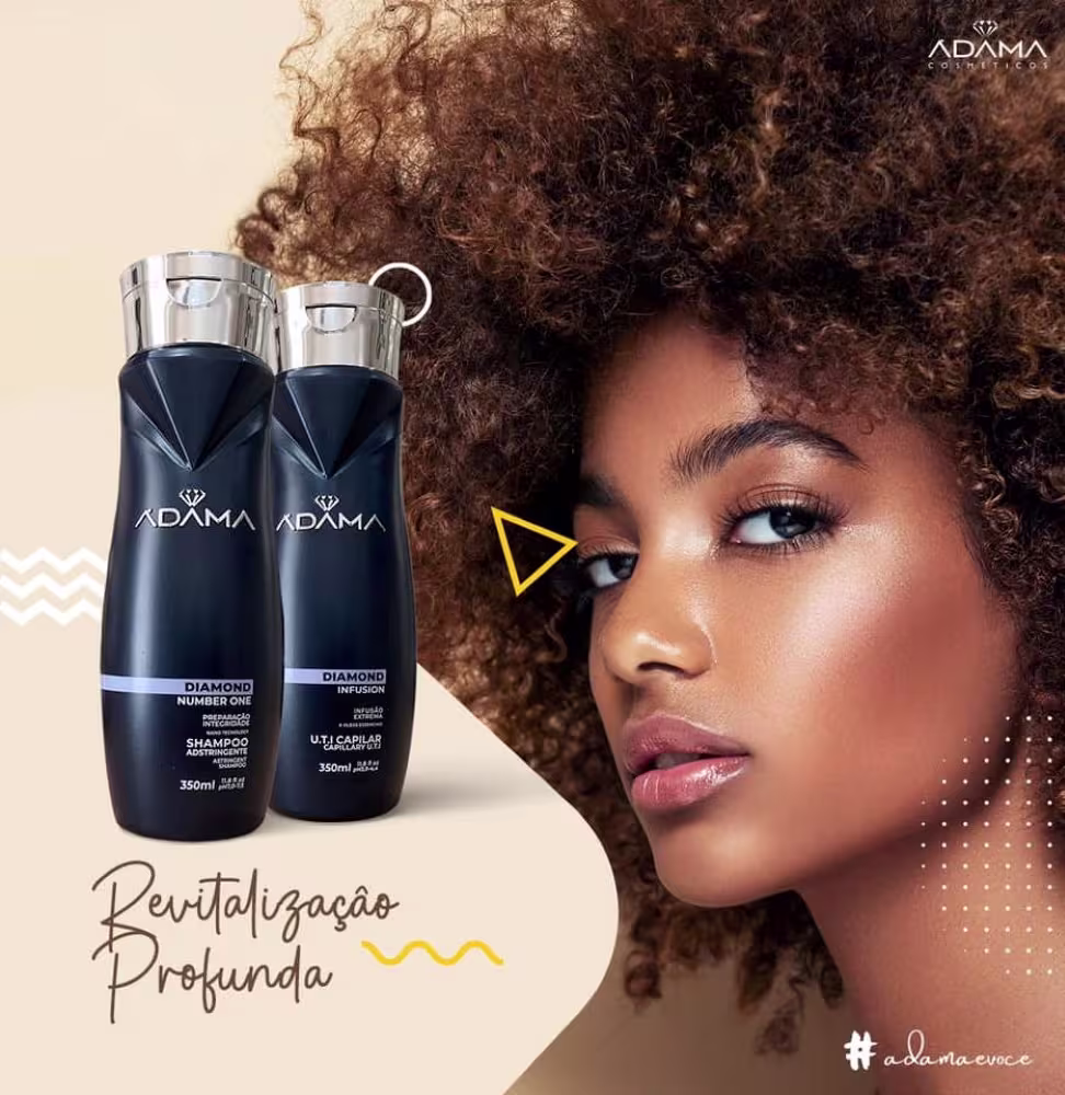 Kit de tratamento para cabelos crespos, secos, ressecados e sem elasticidade. Ádama Diamond Number One Infusion oferece um tratamento capilar intensivo, que limpa profundamente os cabelos para receber uma carga de revitalização extrema.