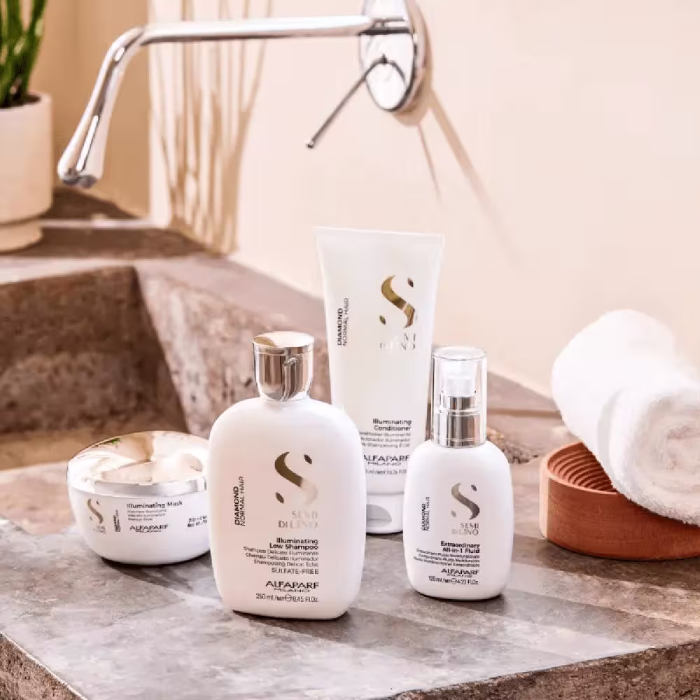 Kit de tratamento para cabelos secos e opacos. Alfaparf Semi Di Lino Diamond Illuminating + Sublime Cristalli, seu novo tratamento diário favorito para fios incríveis.