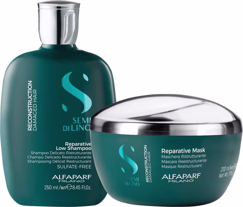 Não sei o CEPKit com shampoo e máscara para cabelos danificados. Alfaparf Semi di Lino Reconstruction Duo Mask combate os danos, recuperando a força dos fios.