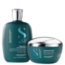 Kit com shampoo e máscara para cabelos danificados. Alfaparf Semi Di Lino Reconstruction Reparative promove fortalecimento regenerador ao fio fragilizado.
