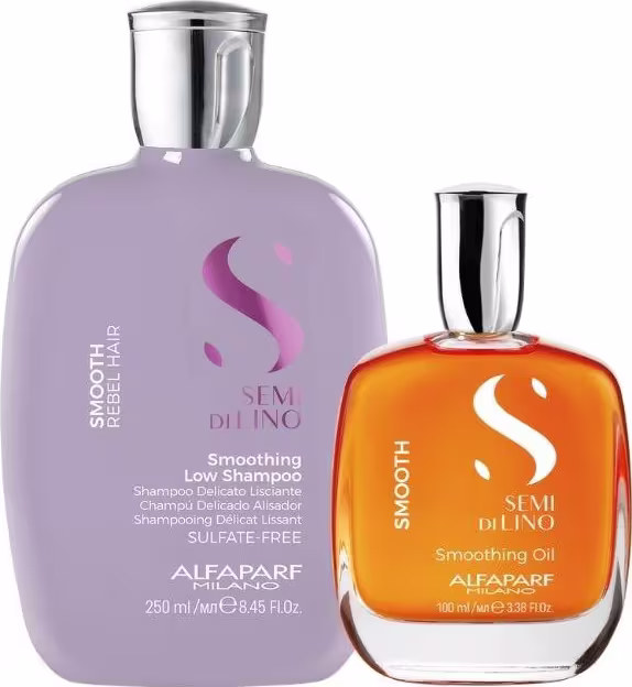 Não sei o CEPKit com shampoo e óleo para cabelos com frizz. Alfaparf Semi Di Lino Smooth cuida delicadamente dos fios, promovendo alinhamento.