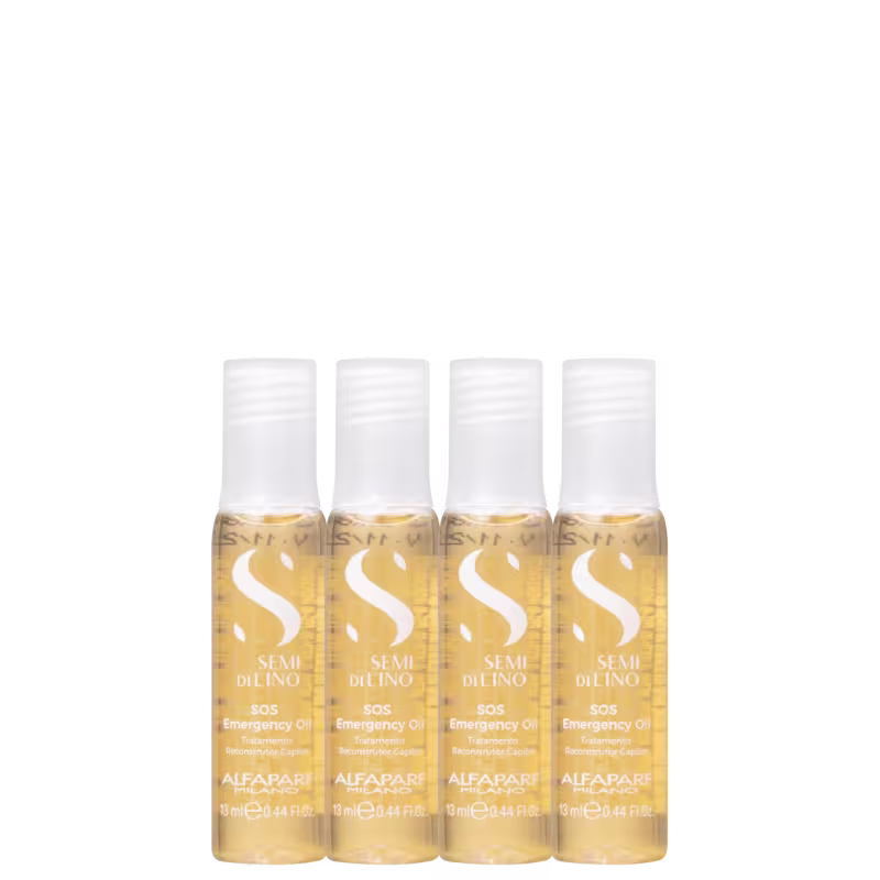 Kit com ampolas de tratamento para cabelos danificados. Alfaparf Semi di Lino SOS Emergency Oil ajuda a reconstruir a fibra para mais saúde aos fios.