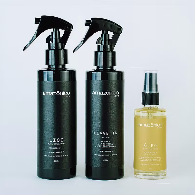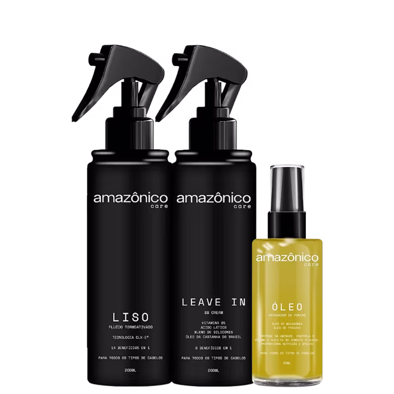 Kit com fluído termoativo, leave-in BB Cream e óleo reparador. Amazônico Care Liso Reparador especialmente desenvolvido para quem procura proteção térmica, reparação e hidratação. Pode ser usado como finalizador ou tratamento reparador.