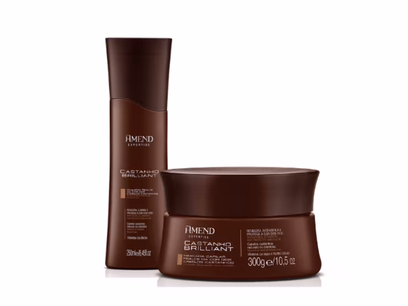 Kit com shampoo e máscara de tratamento para cabelos castanhos naturais ou tingidos. Amend Castanho Brilliant Realce da Cor Duo Mask mantém a cor viva e fios saudáveis.