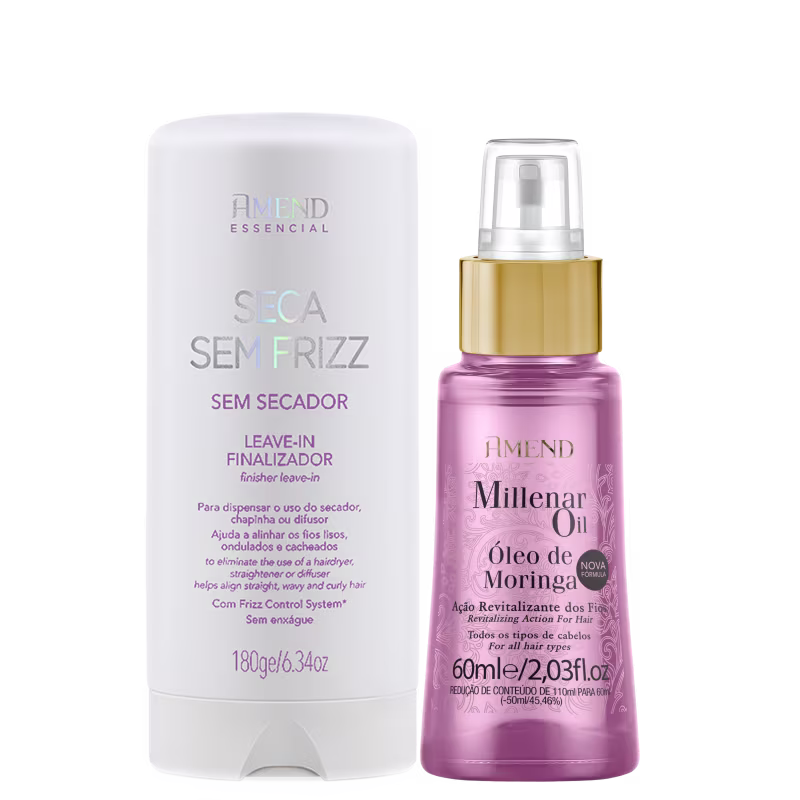 Kit com óleo capilar e leave-in redutor de frizz. Amend Cosméticos Moringa Sem Frizz nutre os fios, garantindo alinhamento e brilho intenso.