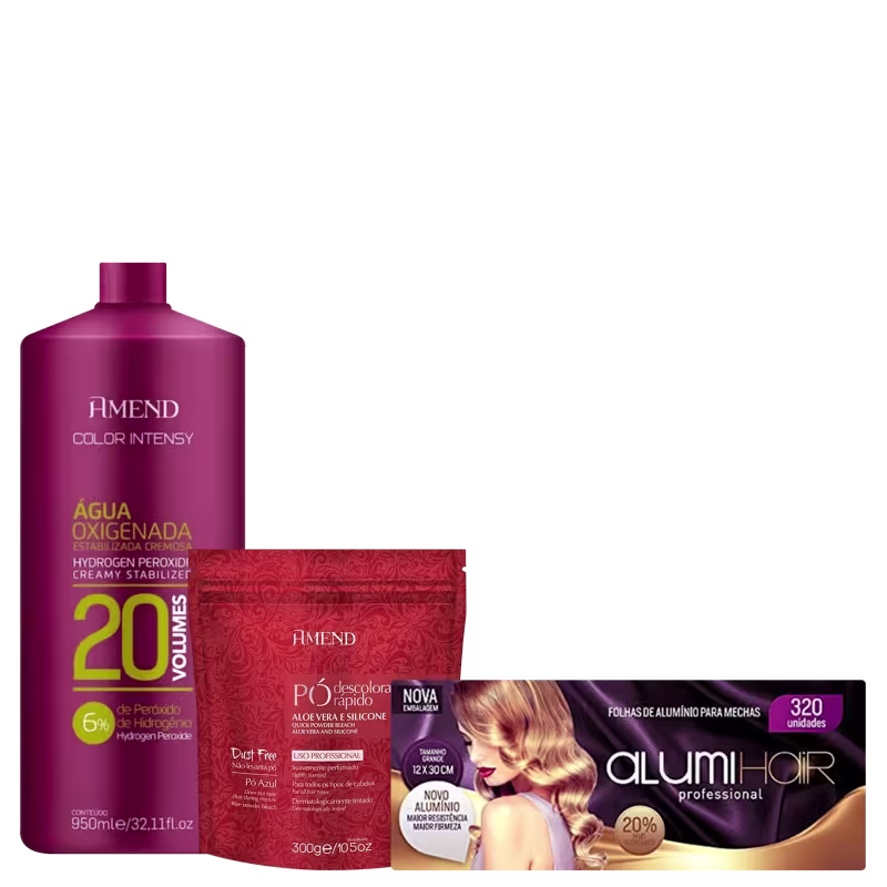 O Kit Amend de Descoloração Profissional apresenta uma água oxigenada 20 volumes, um pó descolorante e folhas de alumínio que tornarão a rotina dos cabelereiros muito mais simples, prática e com resultados impecáveis.