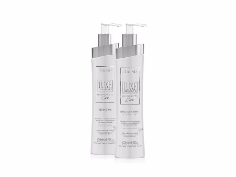 Kit com shampoo e condicionador para cabelos danificados e desgastados. Amend Luxe Creations Regenerative Care trata o envelhecimento dos fios.