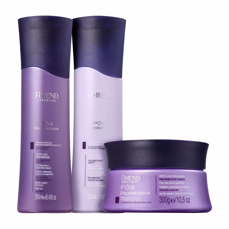 O Kit Amend Pós Progressiva Expertise Trio conta com fórmulas ricas em Aminoácidos que reparam a fibra e nutrem o cabelo para que fique mais forte, mesmo depois do processo químico. Consegue manter a maciez e maleabilidade, além de prolongar o efeito liso e facilitar uma finalização sem frizz e disciplinada.