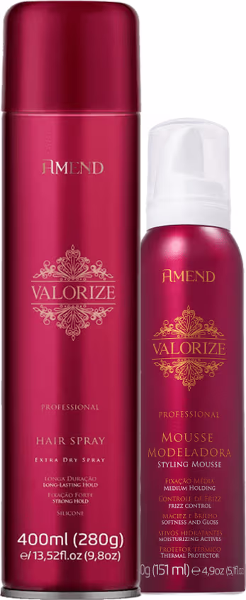 O Kit Amend Valorize Mousse e Spray Fixador Forte traz fórmulas que ajudam a criar camada flexível em torno do cabelo altamente resistente à umidade e que ajuda no controle do volume. Ainda traz ativos hidratantes que conferem uma aparência saudável ao visual, além de possuir proteção térmica.