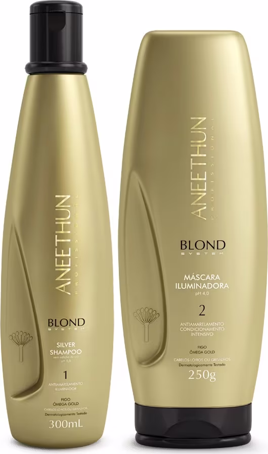 Kit de tratamento para cabelos loiros e grisalhos. Aneethun Blond System Iluminador reaviva o tom claro e neutraliza o amarelo.