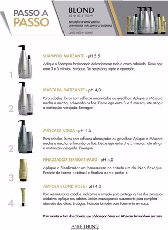 O Kit Aneethun Blond System Iluminador corrige o tom através de uma fórmula com Tecnologia Ótica Reflective A, C, Acid Violet e diversos outros ativos que além de manter o tom adequado, dão vivacidade e saúde aos fios.