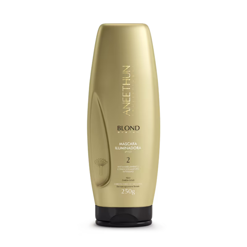 Aneethun Blond System - Máscara Iluminadora 250g: fórmula profissional com Tecnologia Ótica que retira gradativamente o amarelamento dos fios grisalhos e ilumina o tom claro dos cabelos loiros. Atua profundamente, promovendo hidratação e condicionamento intensivo, devolve a vitalidade e garante um brilho sublime. pH 4,0.