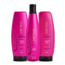 Kit com shampoo, máscara e finalizador para cabelos coloridos. Aneethun Color System Total Trio promove fios com cores vibrantes.