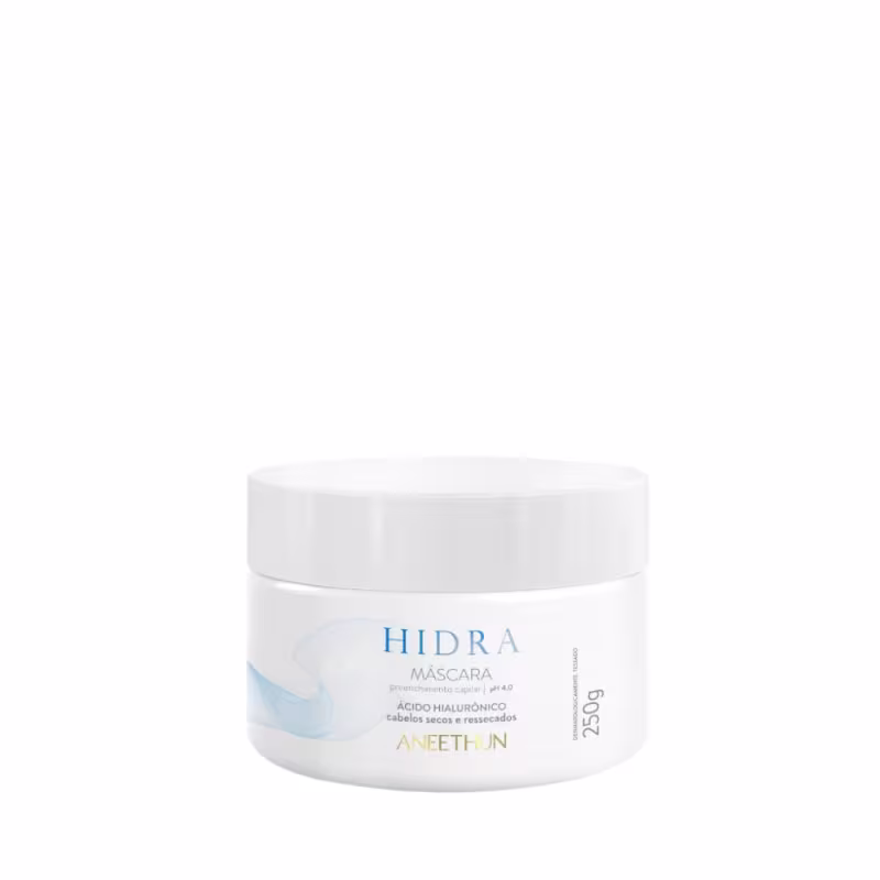 Aneethun Hidra - Máscara Capilar 250g: recupera a umidade perdida dos cabelos, preenchendo a fibra capilar. Sua fórmula altamente hidratante confere resultados duradouros e promove aumento da força e redução da quebra, além de elevar a maciez e o brilho. pH 4,0.