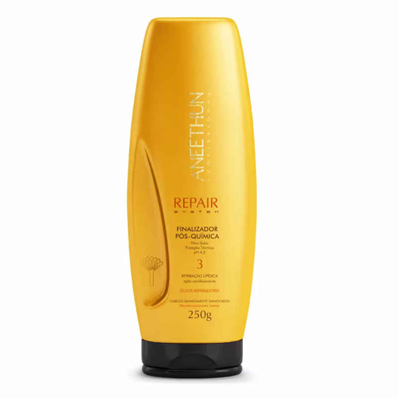 Aneethun Repair System - Finalizador Capilar 250ml: forma um filme hidratante, nutritivo e protetor sobre os fios, sua ação termo protetora trata e blinda os fios durante o processo de escova ou prancha, conferindo brilho e maciez, evitando o surgimento do frizz e das pontas duplas. Possui filtro solar, o que garante maior proteção, auxiliando numa ação antioxidante. pH 4,5.