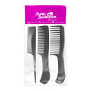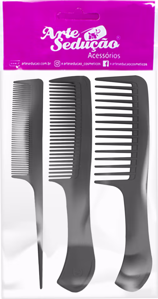 O Kit Arte Sedução Acessórios apresenta 3 pentes de diferentes tamanhos e espaçamento entre os dentes, sendo eles pequeno, médio e grande. Os pentes com pouco espaço entre os dentes são indicados para cabelos lisos devido a maior proximidade com os fios que faz com que eles sejam esticados.