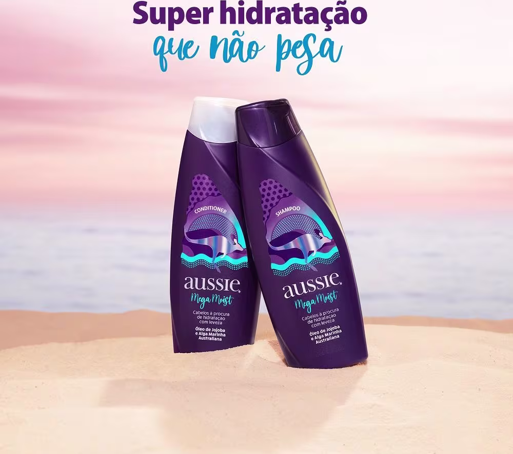 O Kit Aussie Mega Moist conta com Óleo de Jojoba e Alga Marinha australiana para hidratar profundamente, sem deixar o cabelo pesado, além de proporcionar brilho e maciez.
