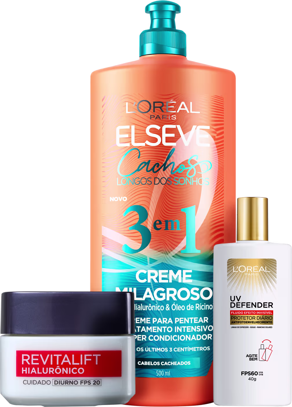 O Kit Beleza na Web L'Oréal Paris Cuidados com a Pele e Cabelo conta com dois produtos para os cuidados com a pele, o primeiro deles é o L'Oréal Paris Revitalift Hialurônico Diurno FPS 20 que retarda o aparecimento das rugas e diminui as linhas finas da cútis sem vida, e o protetor solar facial L'Oréal Paris UV Defender Fluido FPS 60 com ação antienvelhecimento, preventiva de rugas, linhas de expressão e manchas solares. Para o cuidado com o cabelo, o kit oferece o Creme de Tratamento Elseve L'Oréal Paris Cachos dos Sonhos 3 em 1 que nutre e sela os cachos até as pontas para salvar os últimos 3cm dos seus cachos.