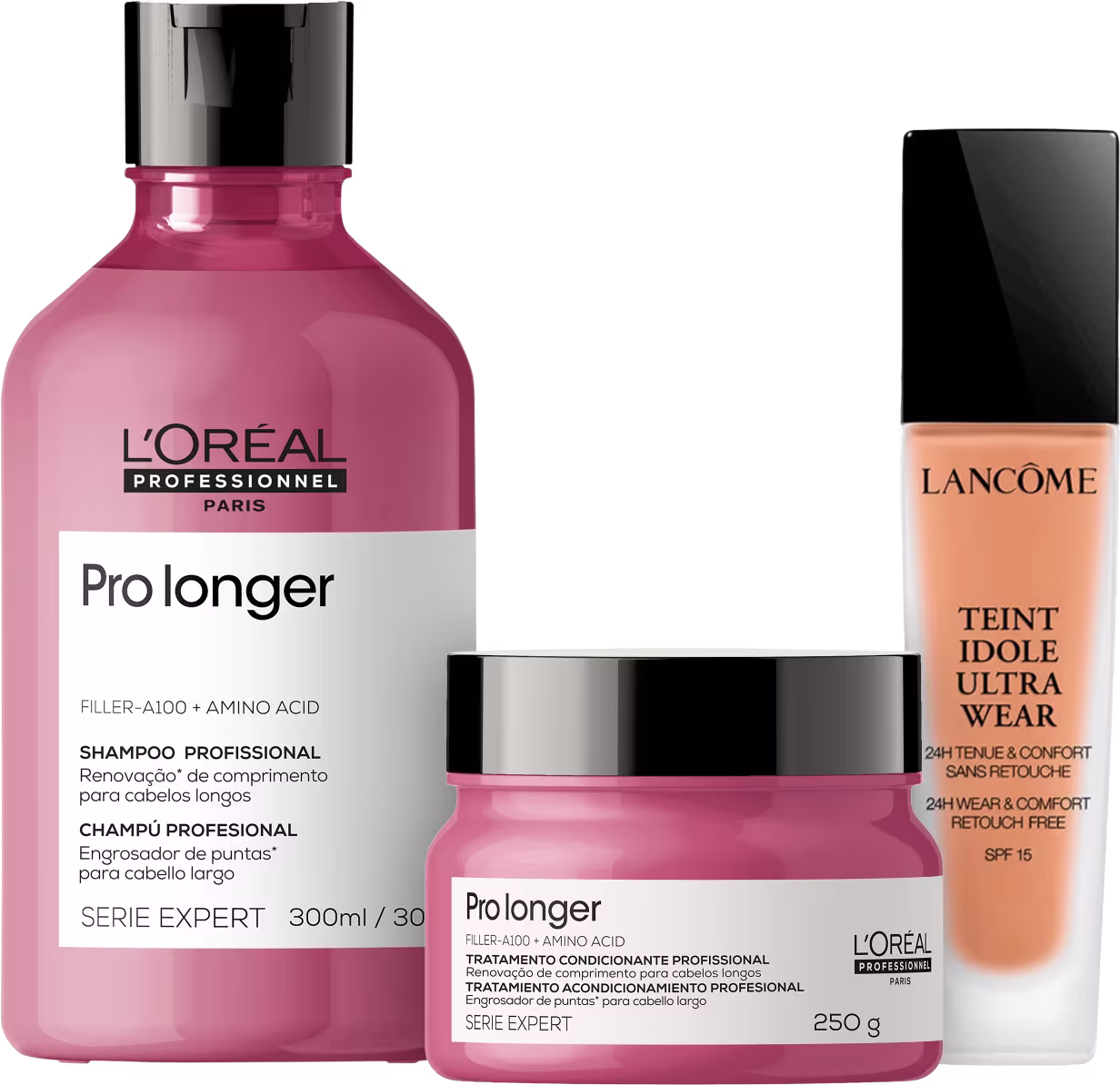 Kit com base líquida de acabamento matte; e shampoo e máscara para cabelos com pontas afinadas ou danificadas. L'Oréal Professionnel Pro Longer & Lancôme Teint Idole Ultra Wear reúne itens para deixar o cabelo e a make poderosos.