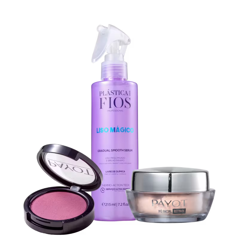 Kit com sérum antifrizz, blush e pó solto. Beleza na Web Magic Beauty oferece liso incrível aos fios, cor às maçãs do rosto e imperfeições disfarçadas.