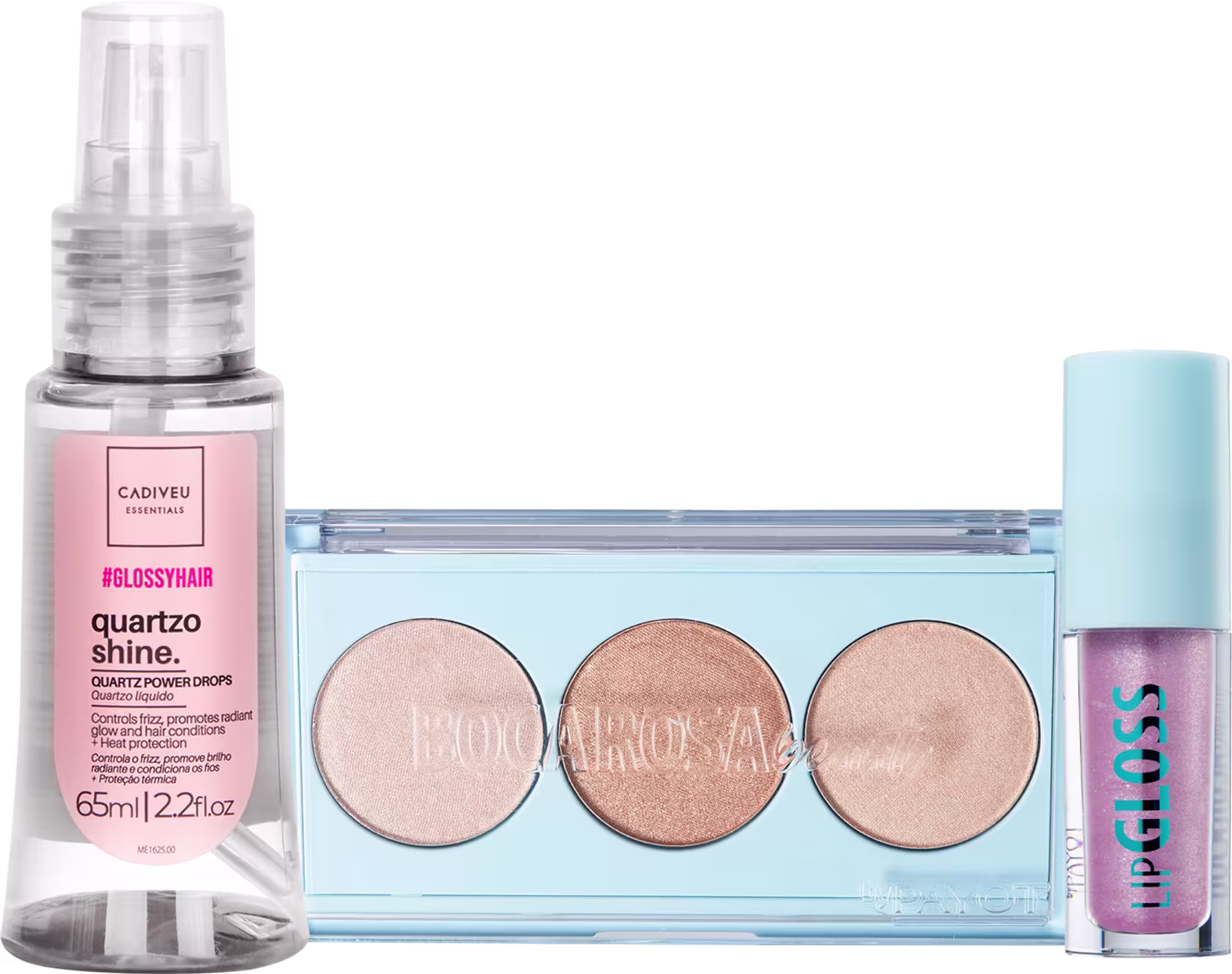 Kit com paleta de iluminadores, gloss labial e óleo capilar. Beleza na Web OMG Glow realça a sua beleza natural com muito brilho.