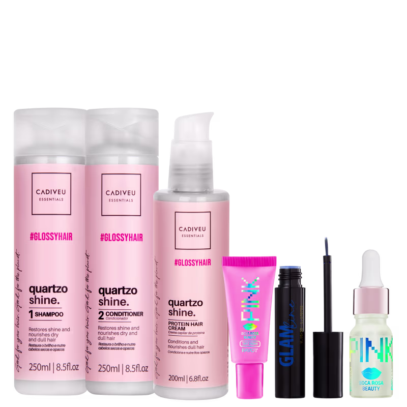 Kit com shampoo, condicionador, leave-in, delineador azul líquido, blush cremoso e gloss labial. Beleza na Web Shine Pink Super realça sua beleza com toque de cor e brilho.